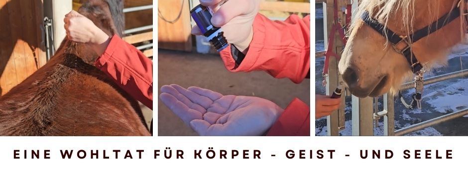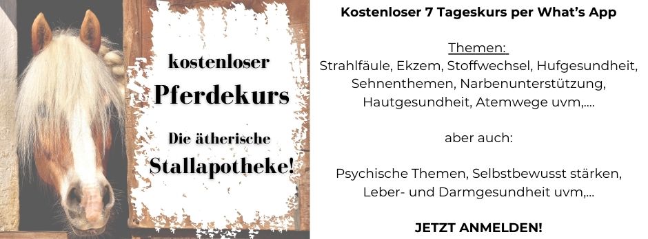 Unsere Pferde reagieren leider schon auf vieles allergisch. Umwelteinflüsse, chemische Pflegemittel, Waschmittel, aber auch schlechte Heuqualität oder suboptimale Fütterungsbedingungen usw. belasten den Organismus. Mit ätherischen Ölen kann eine natürliche Pflege – ohne dass man zusätzliche Chemikalien verwendet - möglich sein und zugleich können die tollen Eigenschaften des jeweiligen Öls auch noch die Pferdepsyche positiv beeinflussen. Ebenso kann aber auch auf psychische Themen eingegangen werden, wie Trennung oder Trauer – die ja auch oft Auslöser für Atemwegsprobleme oder Ekzem sein können - oder Wut, Ärger Zorn, genauso wie Sehnenthemen, ein Zeichen einer überlasteten Leber sein können. Wenn wir also unsere Pferde ganzheitlich betrachten und allgemein das Wohlbefinden auf mehreren Ebenen unterstützen, dann kann die Gesundheit allein dadurch positiv beeinflusst werden. Diesen ganzheitlichen Blick zeige ich euch gerne in meinen kostenlosen Kursen.